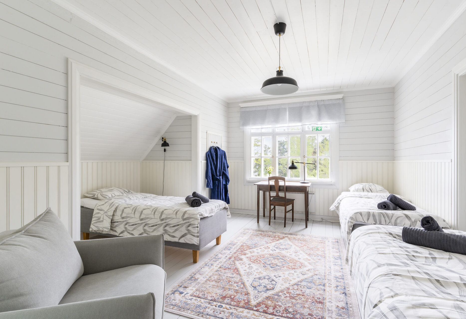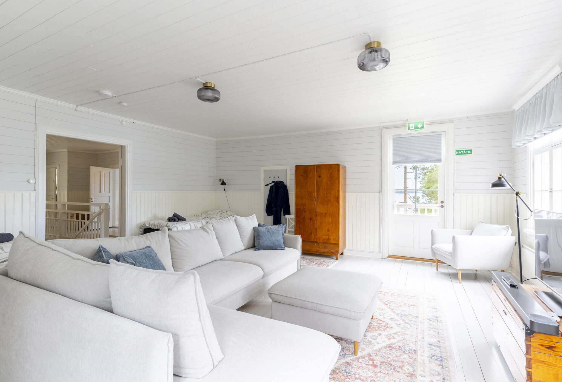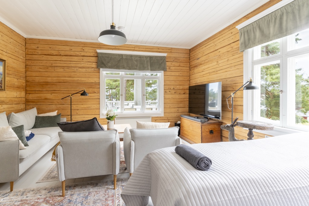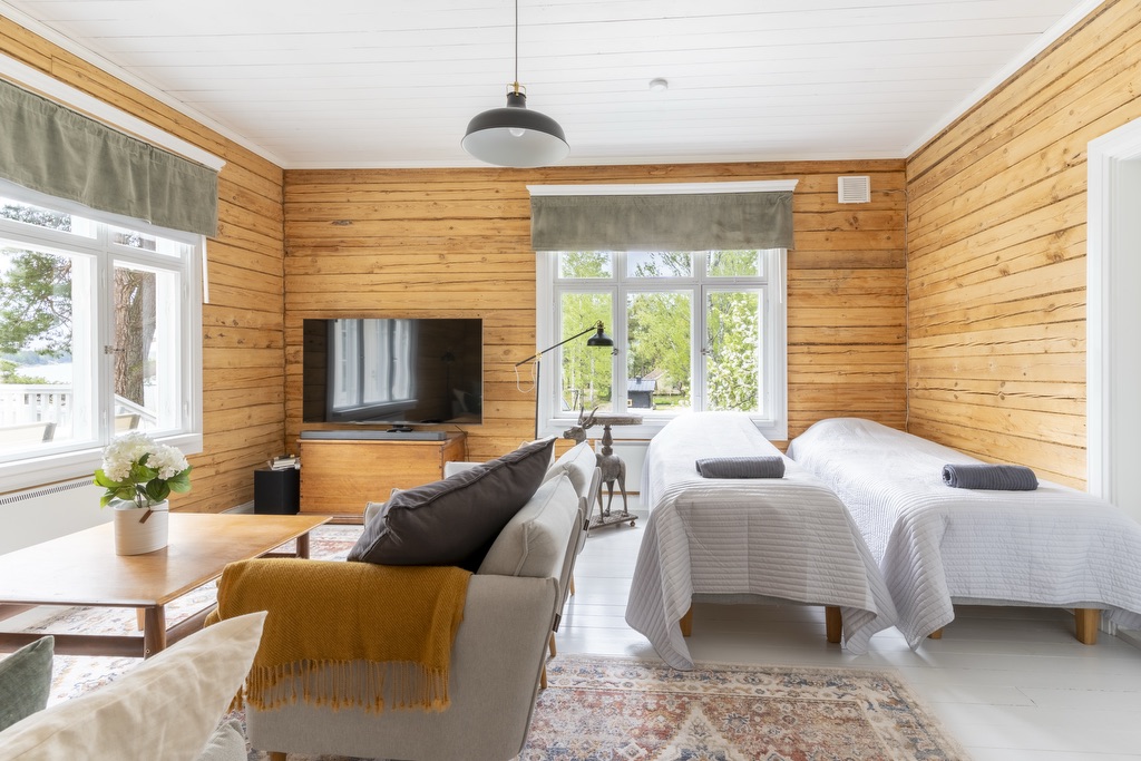 Makuuhuoneet on varusteltu yhden hengen vuoteilla, joita voi yhdistää vieraiden toiveiden mukaan parisängyiksi. Osasta makuuhuoneista löytyy myös vuodesohvia. Huoneisiin on mahdollista saada lisävuoteita. Huvila on varusteltu myös lasten matkasängyllä sekä muilla pienemmille yöpyjille tarvittavilla varusteilla. Huvilan alakerta on esteetöntä tilaa.
